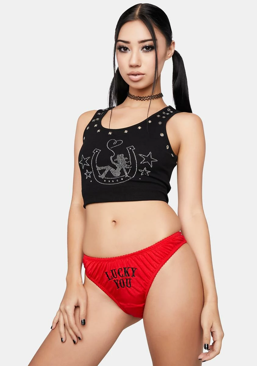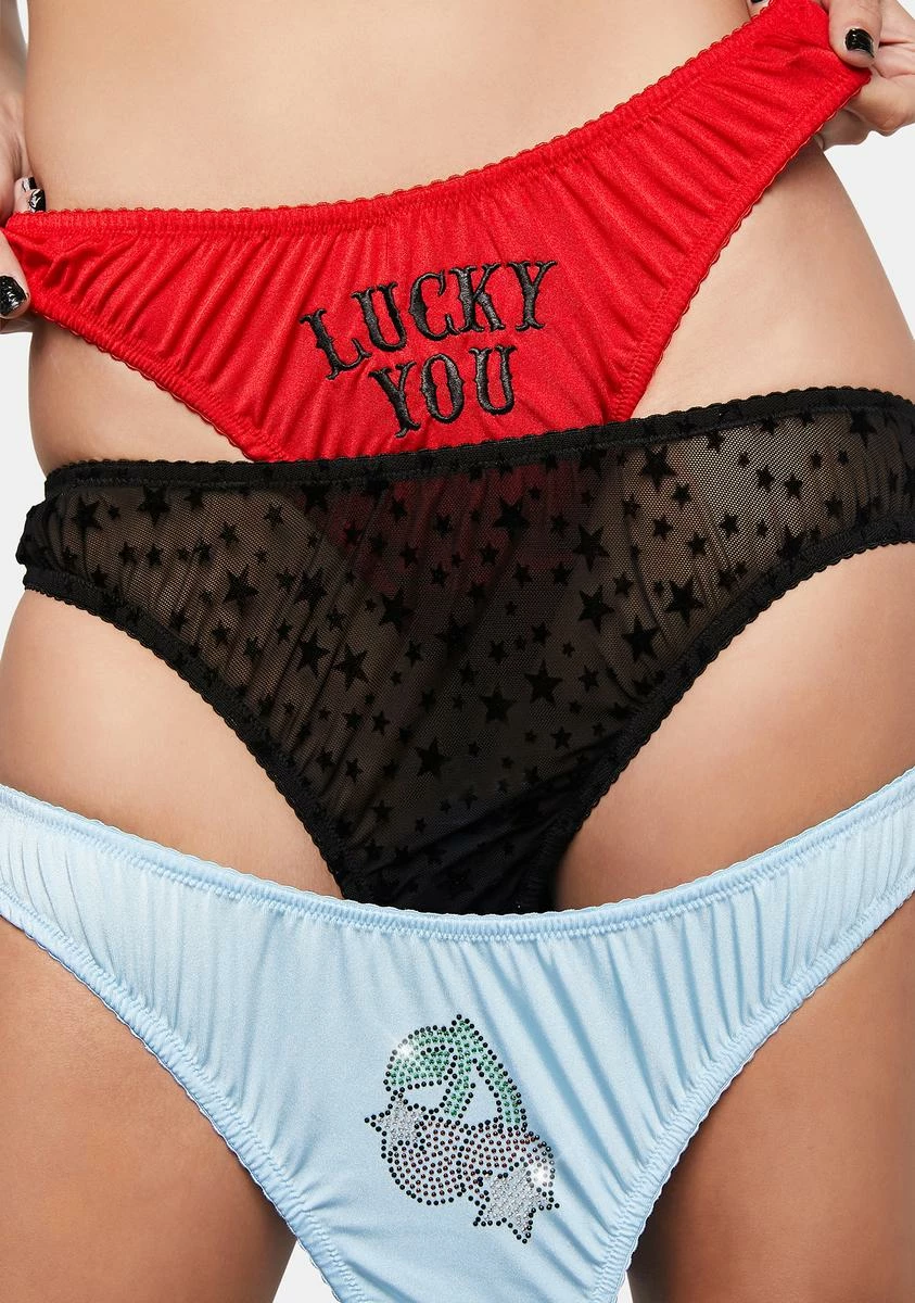 cuz only the lucky ones hit the jackpot. Show them your winnings in this 3-piece panty set that features separate designs like “Lucky You” embroidery, a sheer fabrication with stars all over, and a rhinestone-embellished cherry.