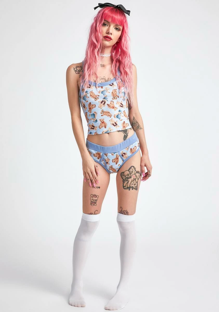 because you’re always just gonna be one big kid. This thermal set comes with a cami tank and a pair of underwear briefs that have a teddy bear pattern print all over.