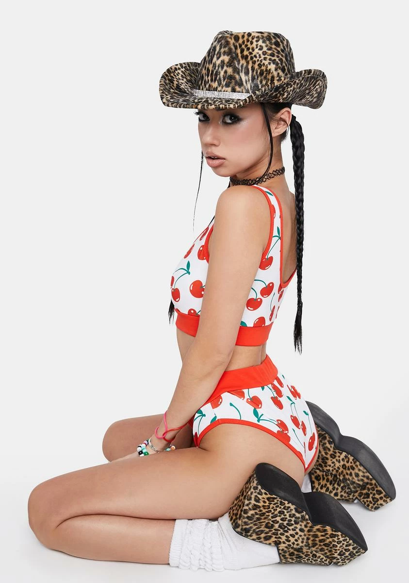 you wanna piece of me? Indulge your taste buds in this sports bra top and brief undies set that features a playful cherry print all over, a cinched detail at the bust, and contrast trim and banding.