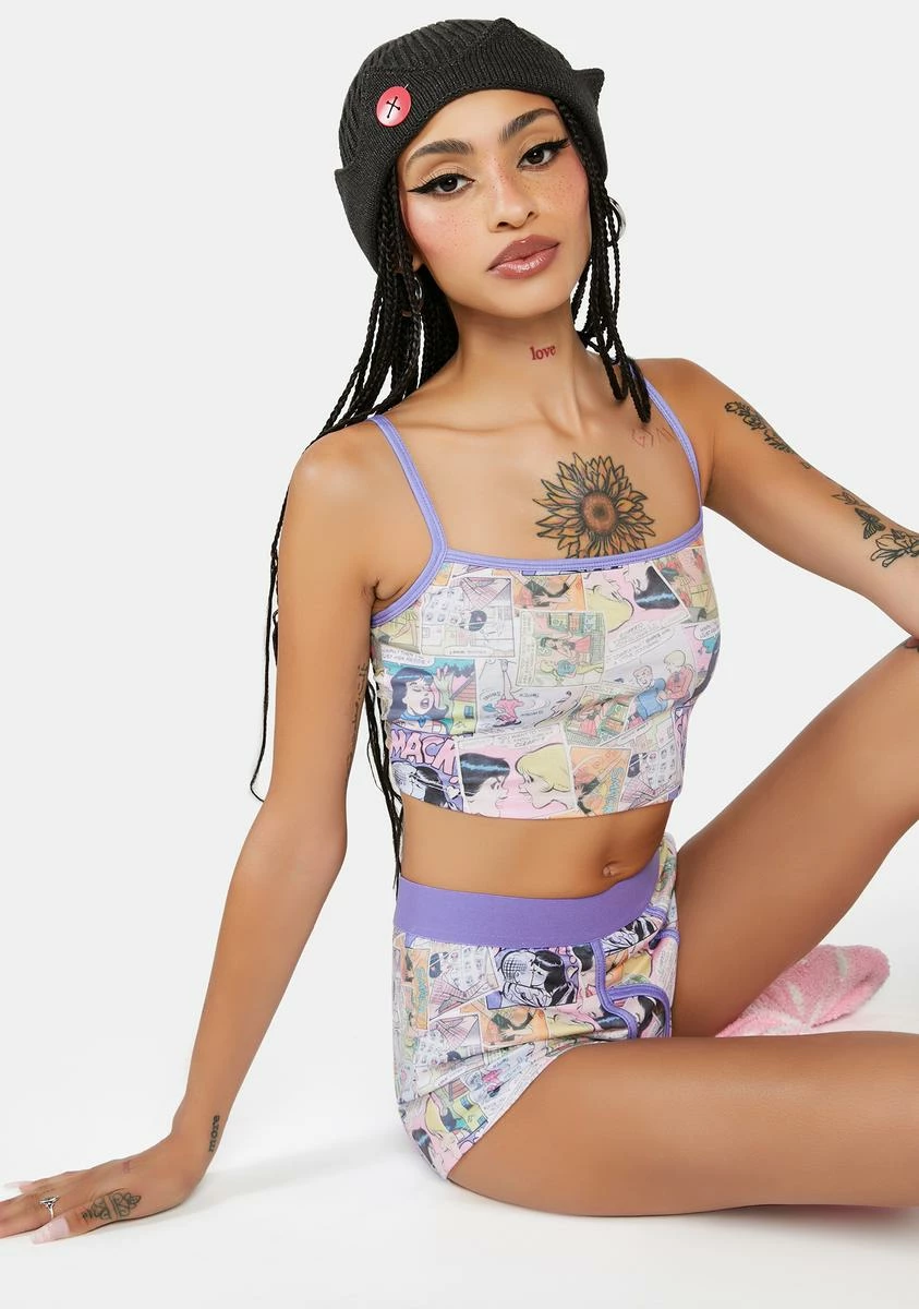 cuz you’re an avid reader. This cropped pajama top has comic book graphics all over, a comfortable and stretchy jersey construction, contrast-colored trim, and adjustable shoulder straps.