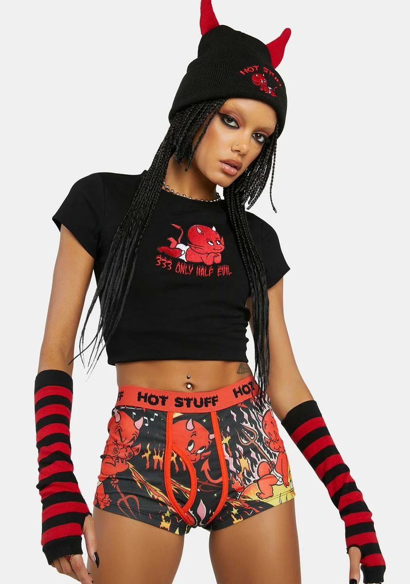 cuz the devil will always find you. These mid-rise boy shorts have Hot Stuff and flames printed all over, a stretchy jersey construction, and an elastic waistband.