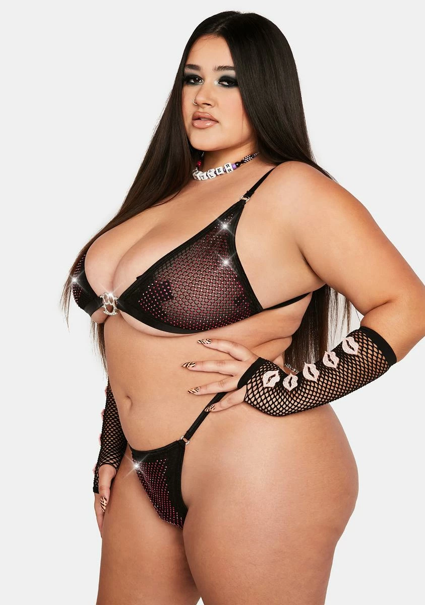 cuz what do you like to do in the dark? Get those kinks out with this lingerie set that includes a triangle bra top that has a fishnet construction, adjustable shoulder straps, pink rhinestone detailing, rhinestone encrusted o-ring hardware, a knuckle charm detail on the front, and a matching thong panty with a chain thong strap with rhinestone charms that spell out “Hustler.”