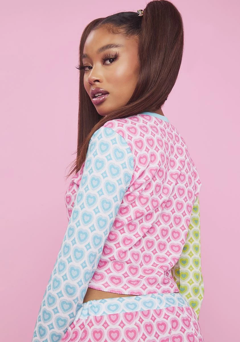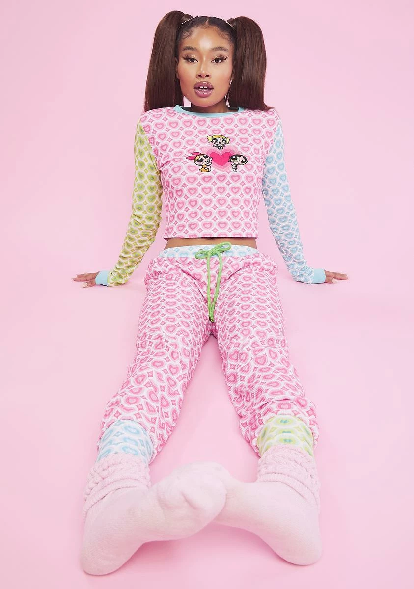 you’re not so naughty…for now. Spread the love in this crop top with long sleeves, contrast colored ribbed trim at the cuffs and crew neckline, a paneled color block design with a heart print all over, and a Blossom, Bubbles and Buttercup graphic on the front.
