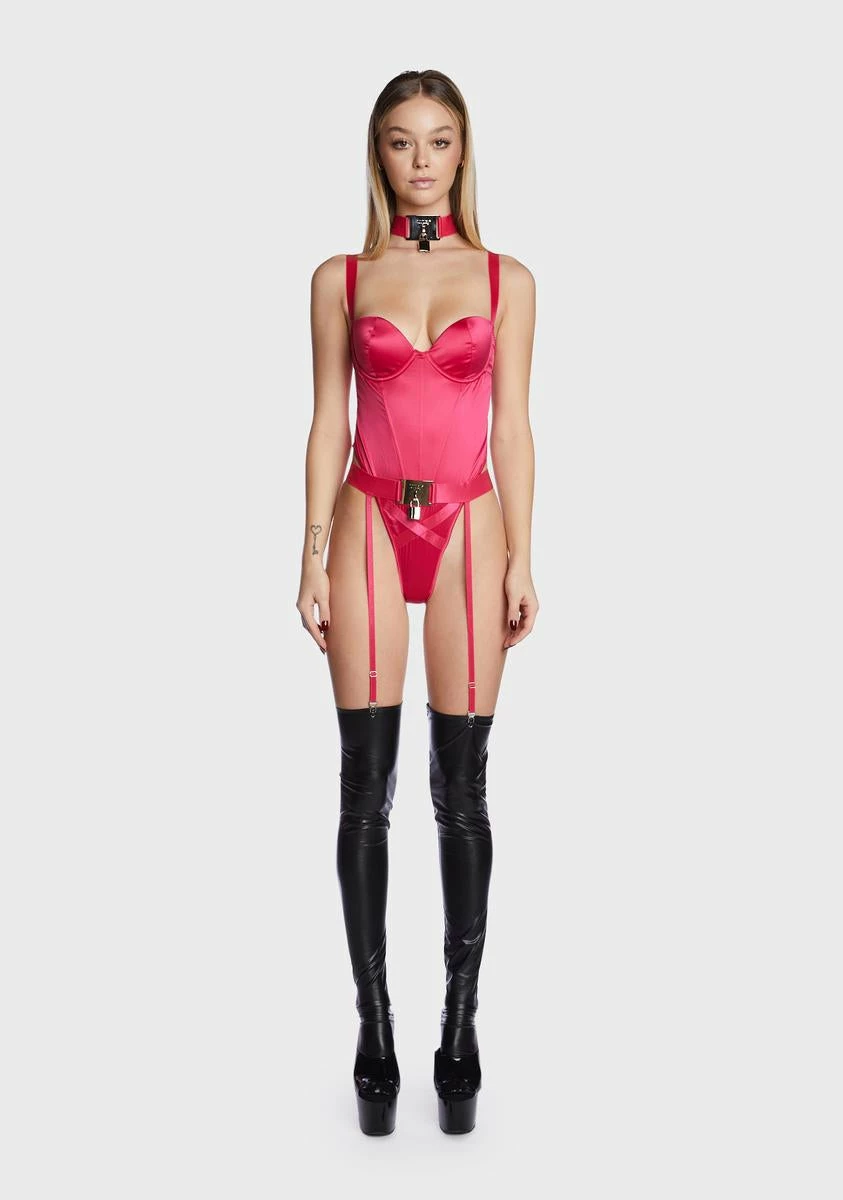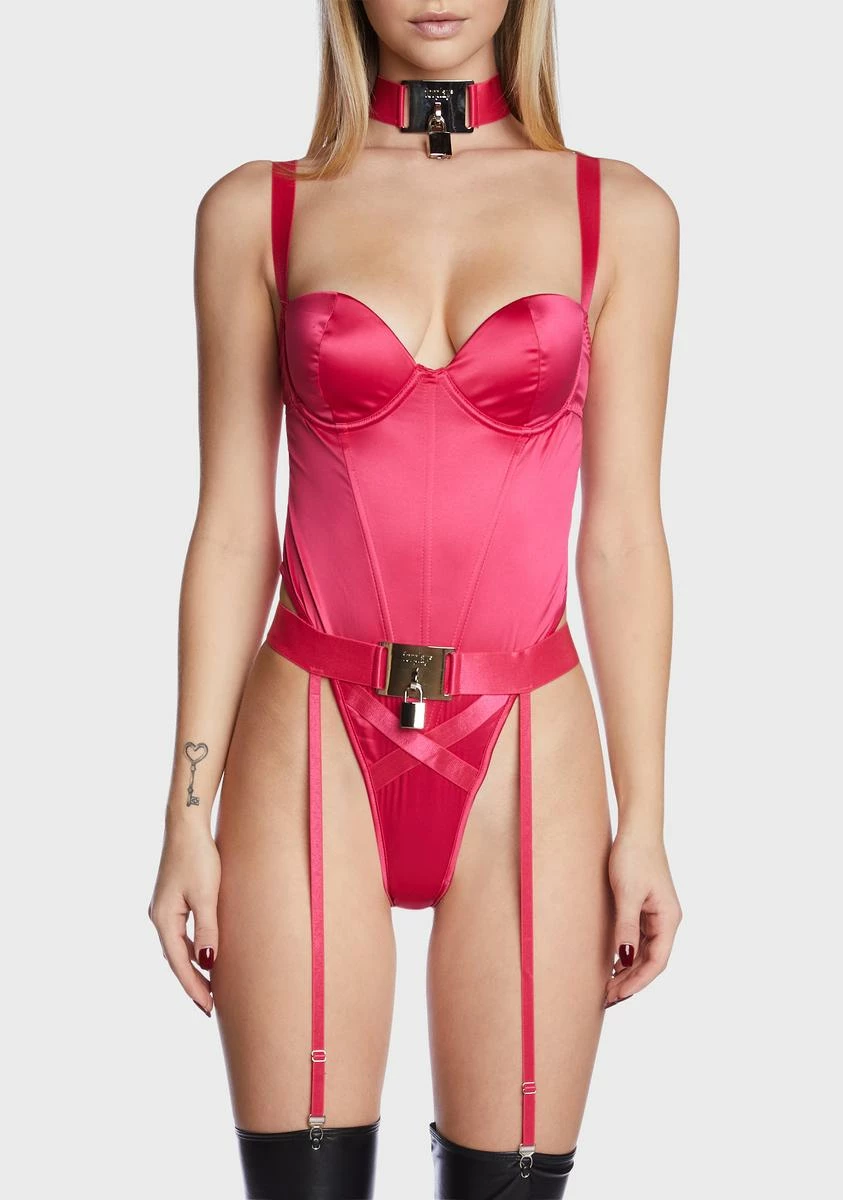 throw away the key. This teddy comes in a satin construction, with underwire, adjustable straps, and hook and eye closures. Includes garter belt and choker.