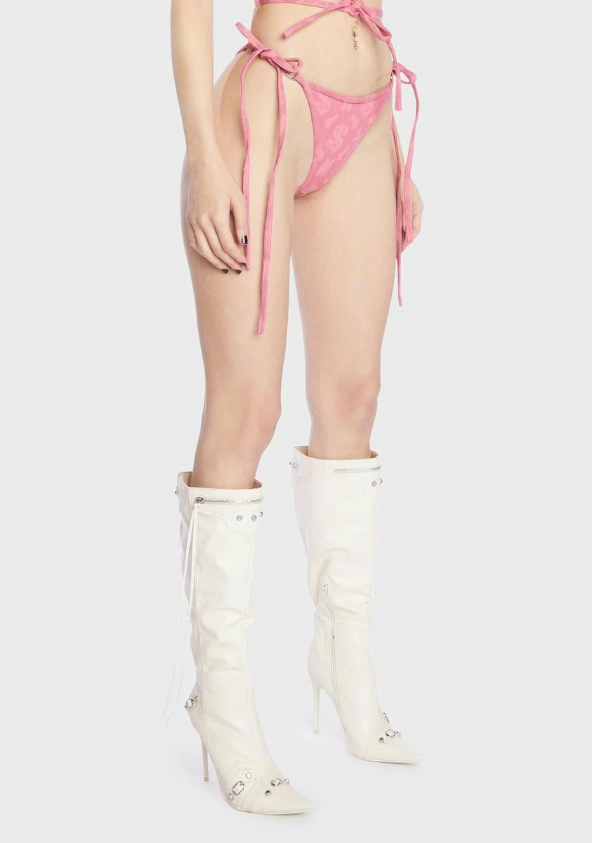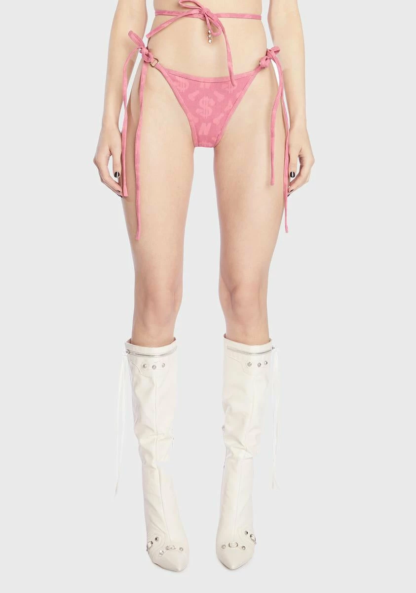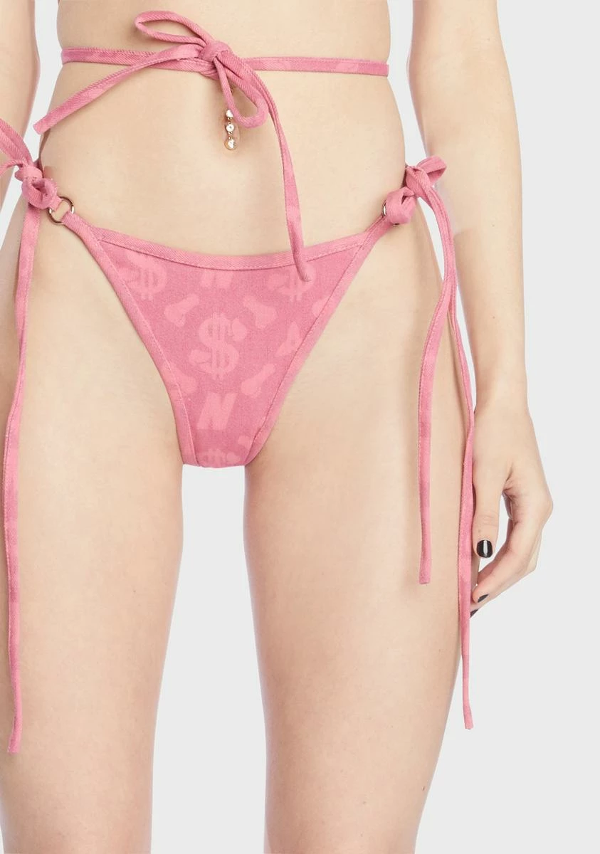 cuz you’re too hot to handle, babe! This thong panty has a denim construction, adjustable tie strap closures, and a dick dollar sign print all over.