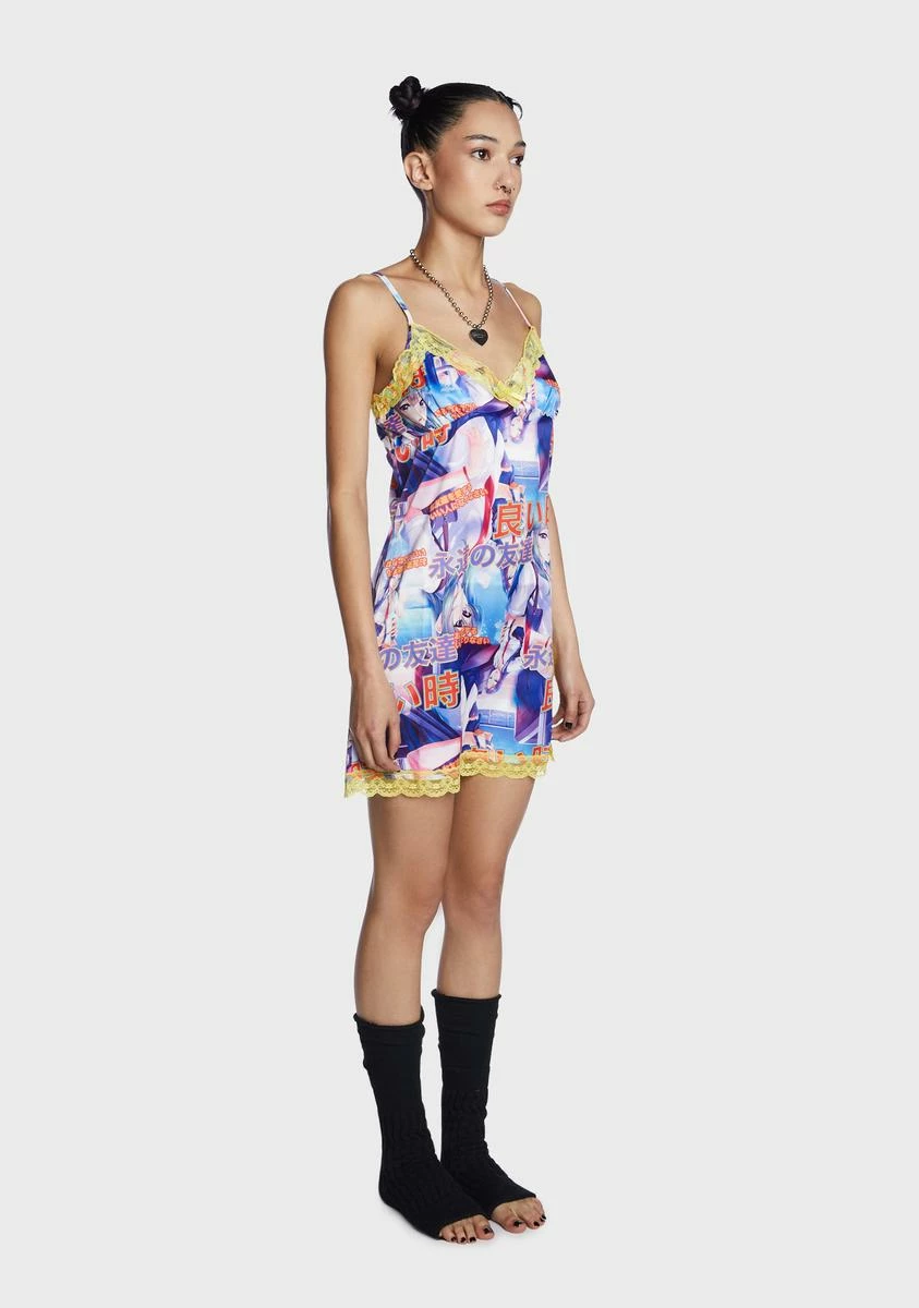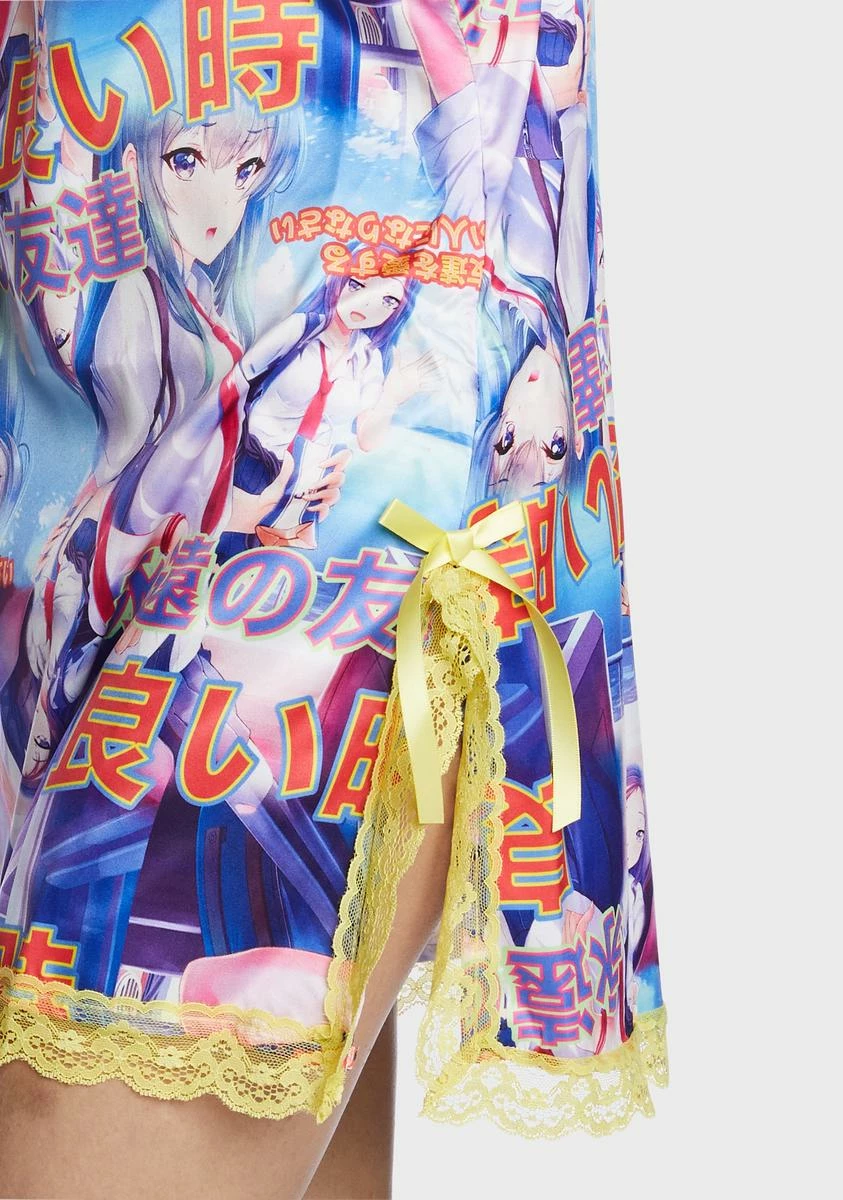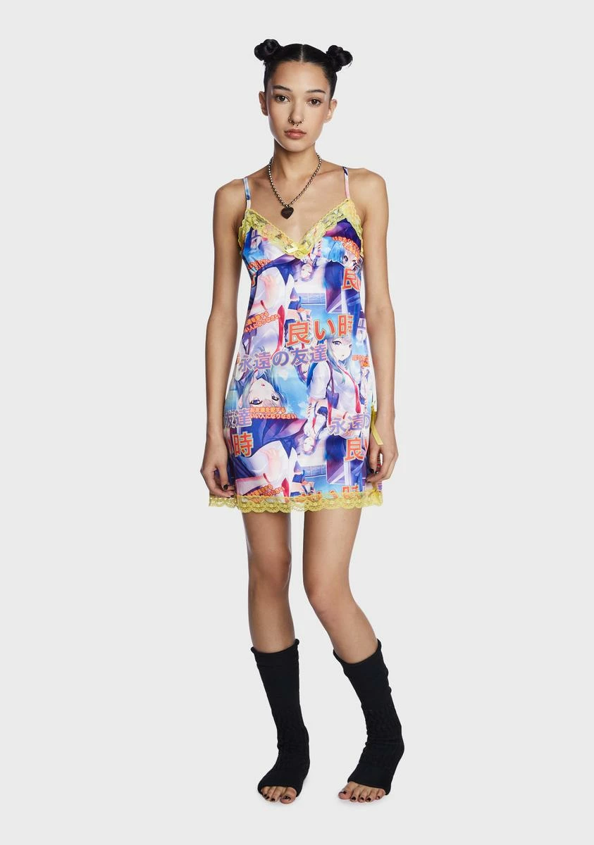 anime fans, gather ’round! This mini chemise dress has anime graphics printed all over, lace trim, bow appliques, adjustable shoulder straps, and a side slit.
