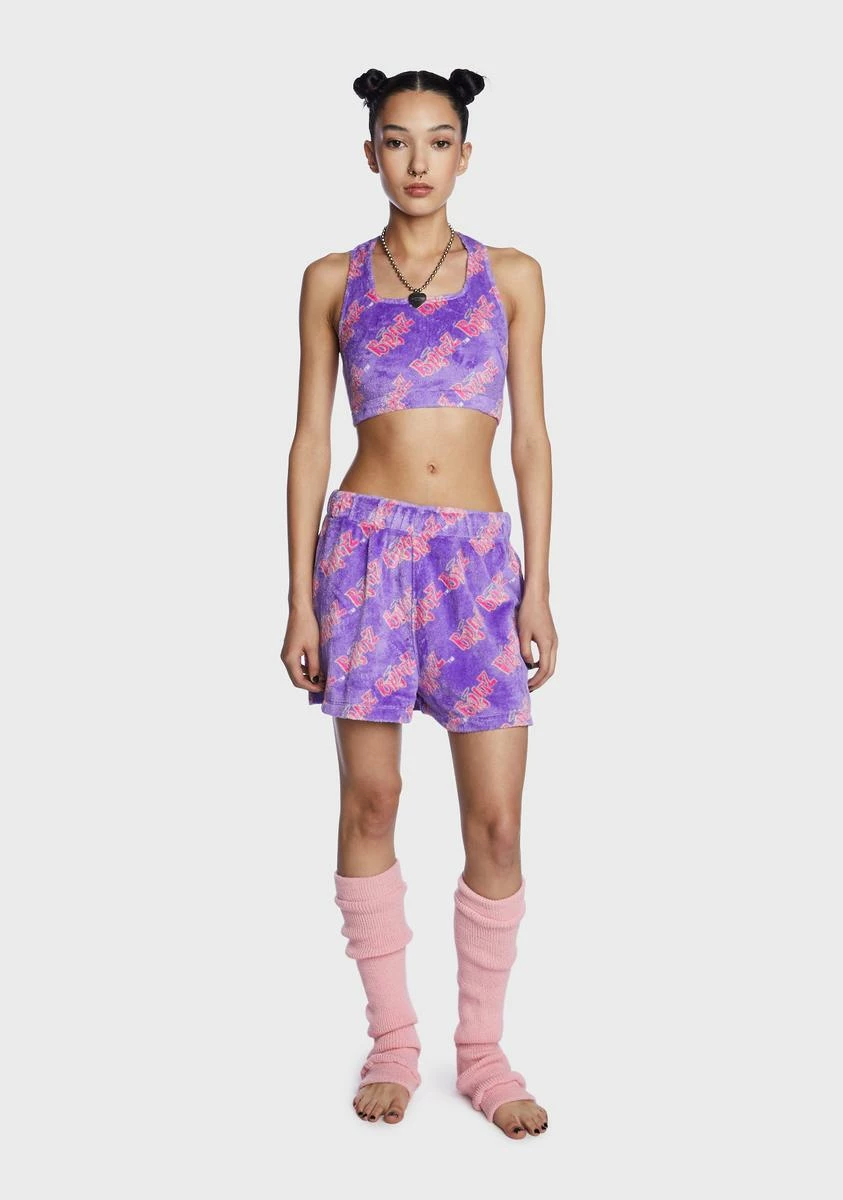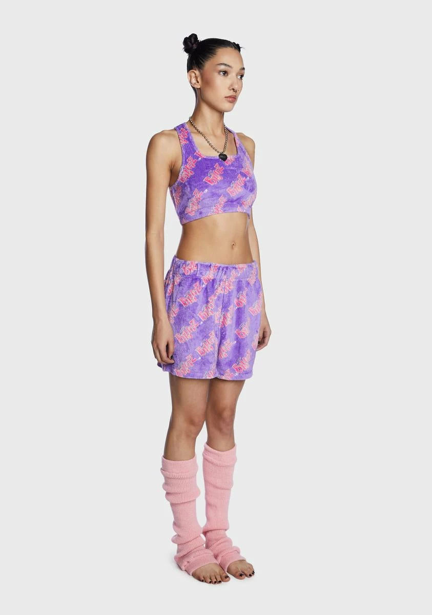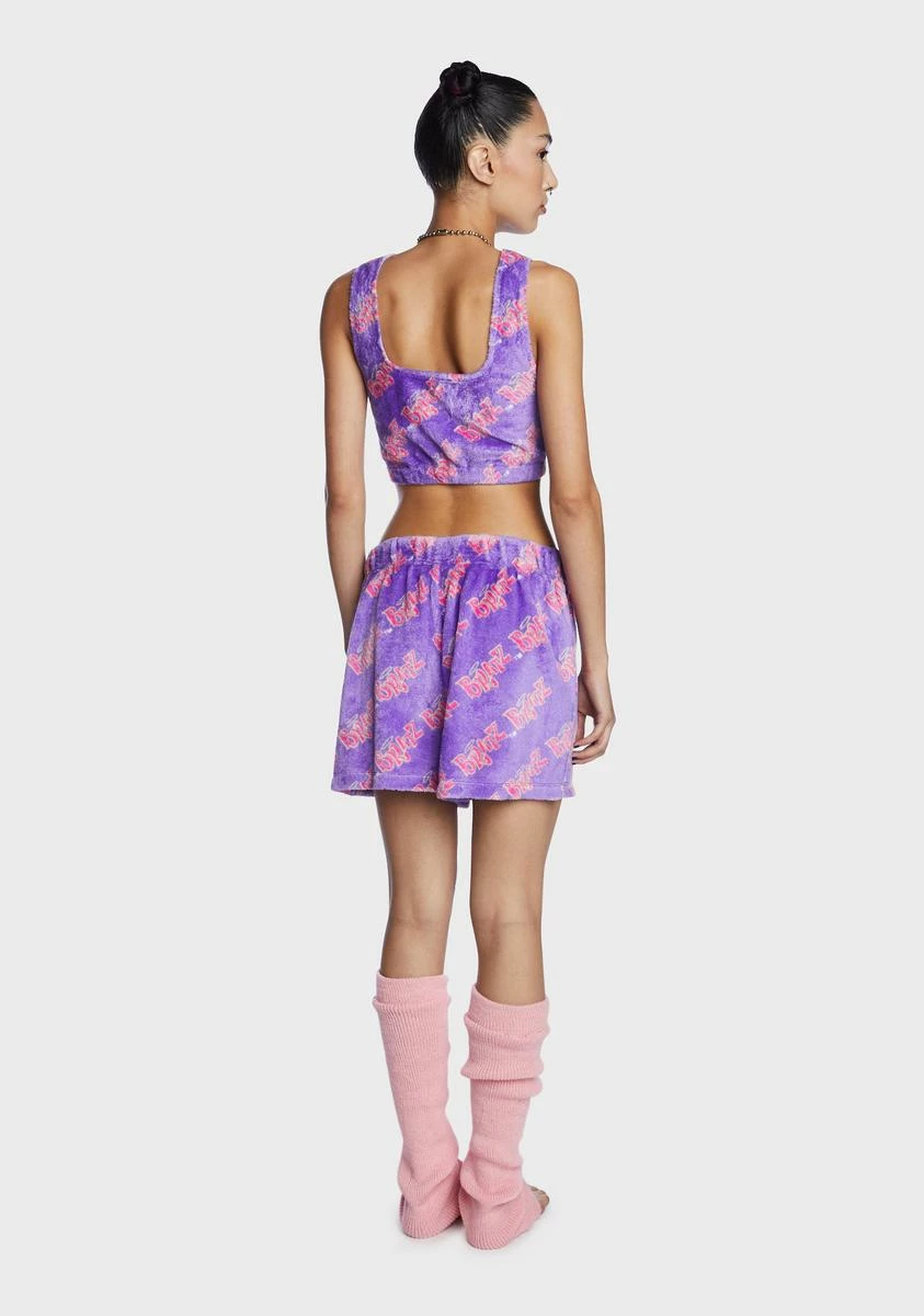 cuz it’s good to be a Doll! This sleep set has a fuzzy faux fur construction, branded Bratz graphics printed all over, and a stretchy elastic waistband. Includes a cropped bralette top and low-rise shorts.