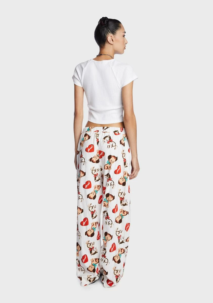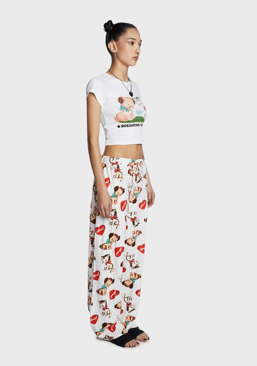 got your head in the clouds! This sleep set has “Dreaming Of You” printed at front, puppies and hearts printed all over, and adjustable drawstring ties. Includes a short sleeve cropped baby tee and low-rise pants.