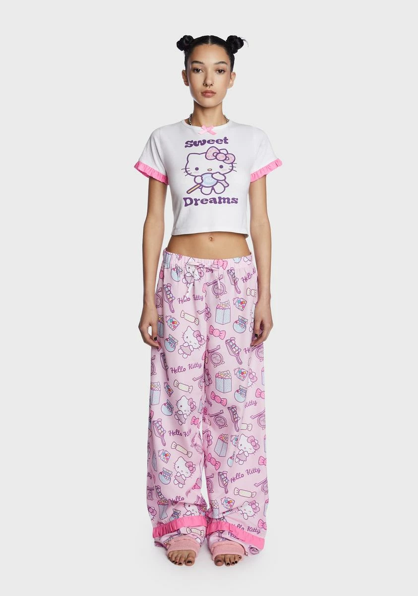 cuz it’s time for your beauty sleep! This sleep set has “Sweet Dreams” printed at front, Hello Kitty graphics all over, a bow applique, and adjustable drawstring ties. Includes a short sleeve crop top and low-rise pants.