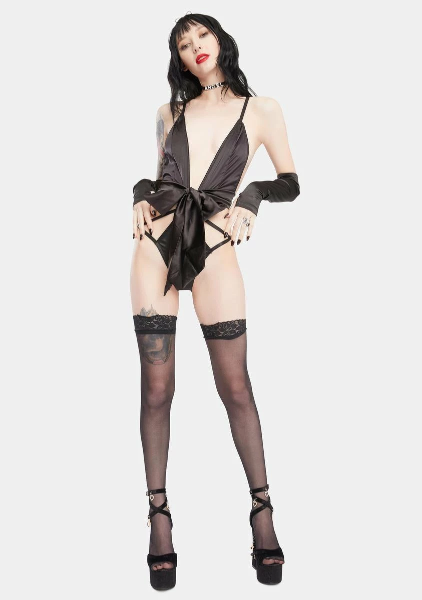 you’re putting on a show tonight. This sexy teddy has a soft silk construction, a plunging neckline, a waist tie, and a strappy caged back with a heart charm detail.