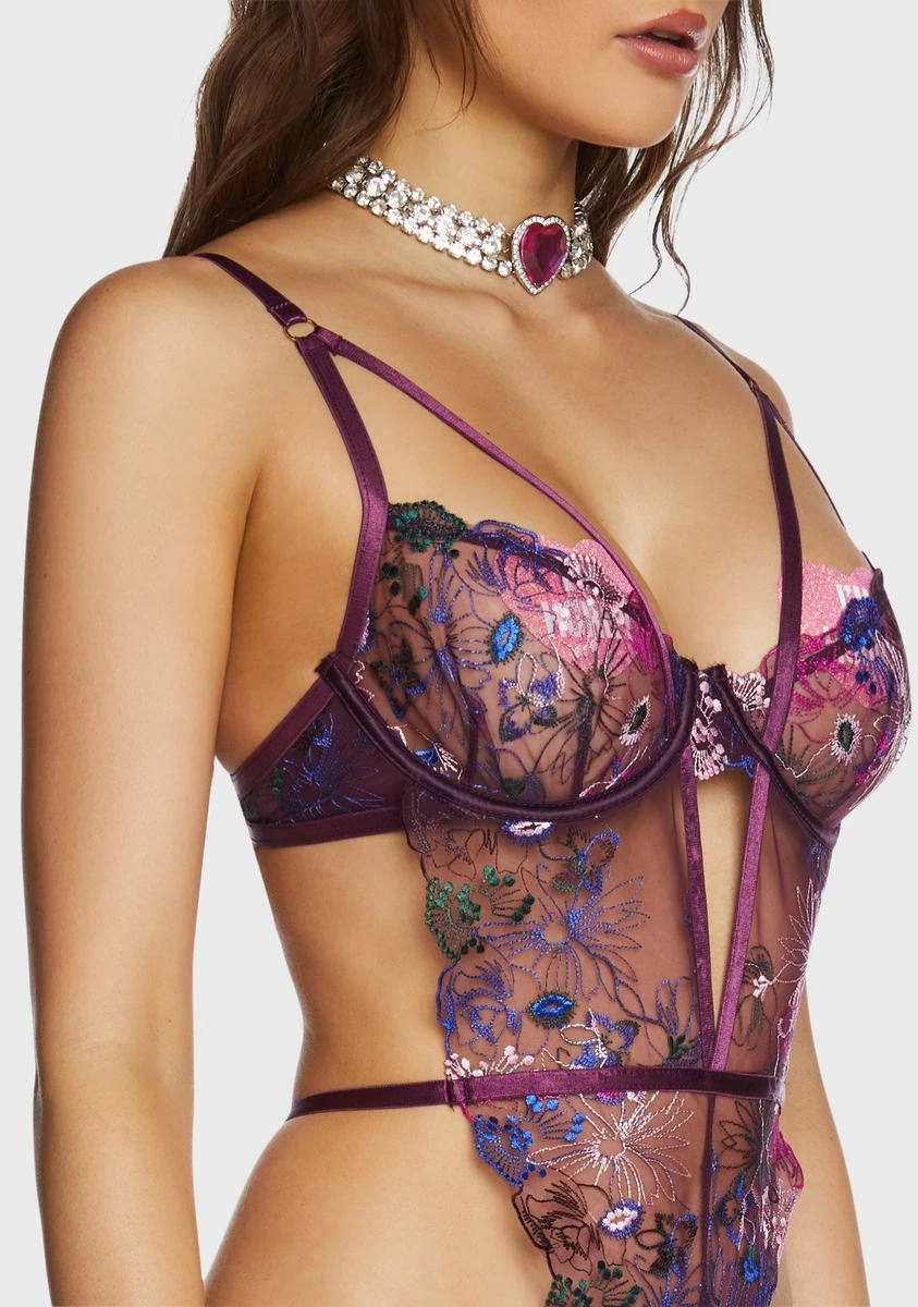 got jaws droppin’ and heads turnin’! This teddy has a sheer lace and mesh construction, a front cutout, underwire bust cups, adjustable shoulder and back straps, and back hook-and-eye closures.