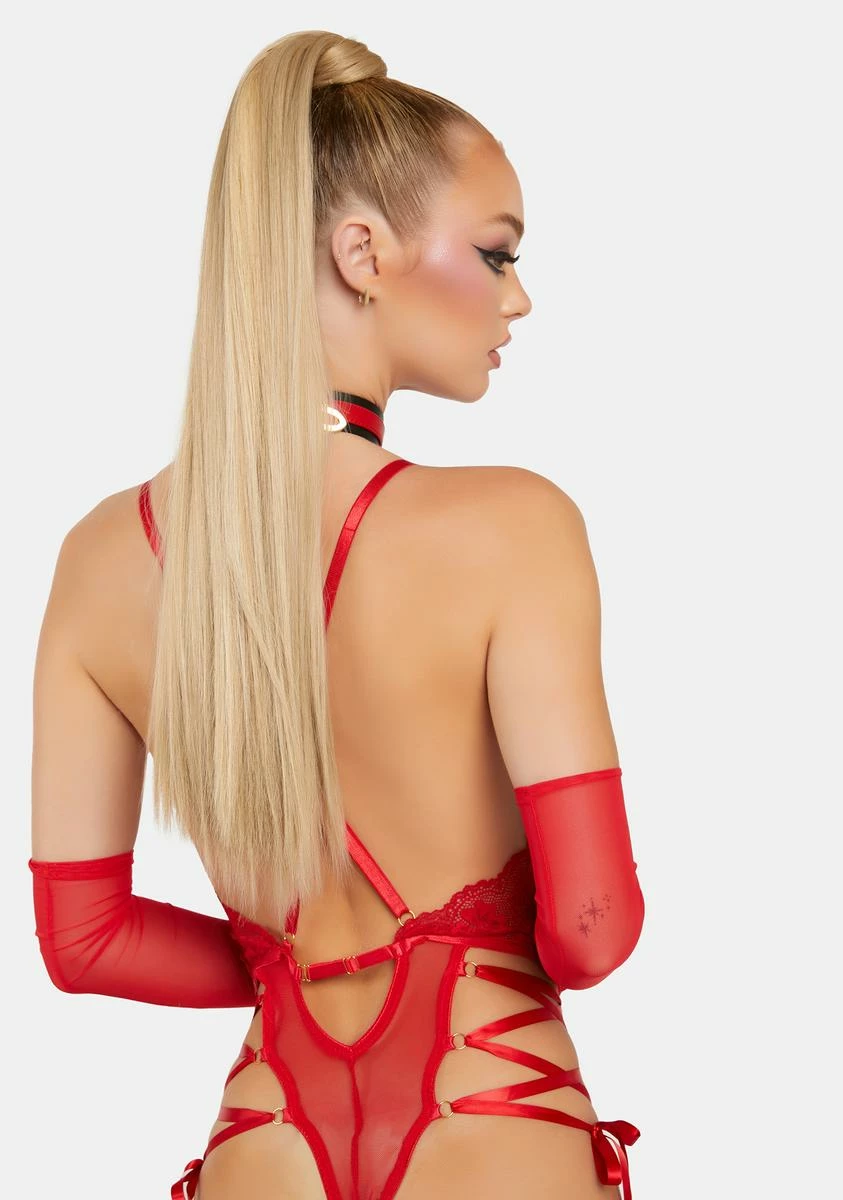 cuz made you look. This teddy has a stretchy sheer lace and mesh construction, a plunging neckline, a ribbon lace up design on the sides, a criss cross back, and adjustable shoulder straps.