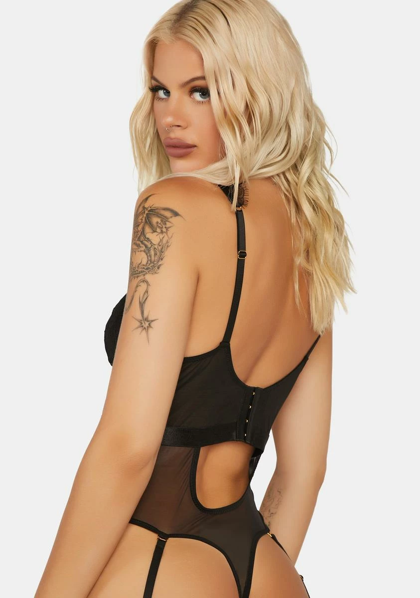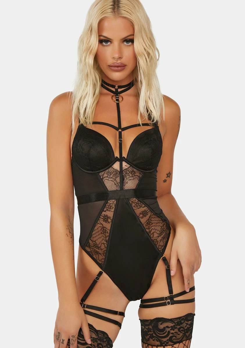 cuz you can’t be good all the time. This bodysuit has a stretchy sheer lace and mesh construction, opaque bust cups, strappy details with adjustable sliders, O-ring hardware at front, and a cutout back with hook-and-eye closures.