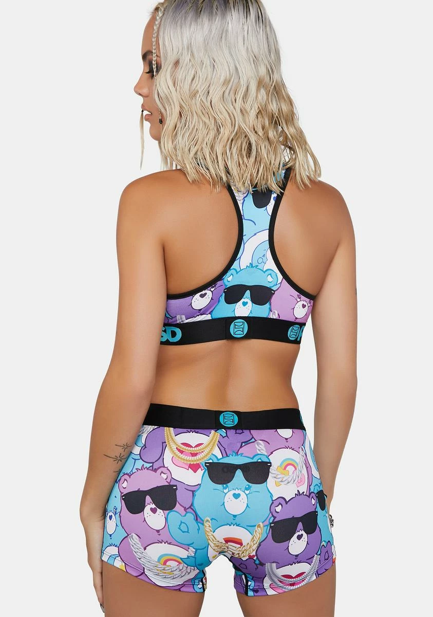 rep what you love. These boy shorts come in a stretch construction, with contrasting trim, logo details, and a Care Bear print all over.