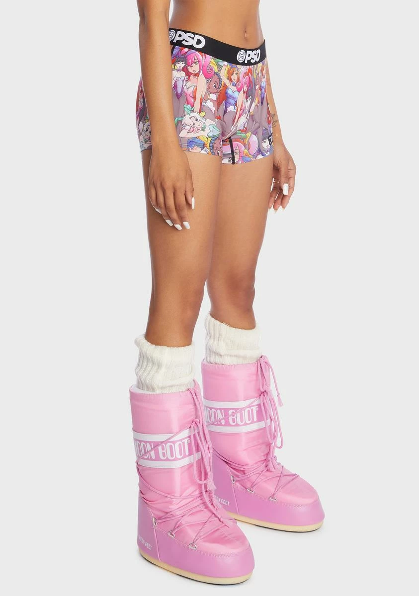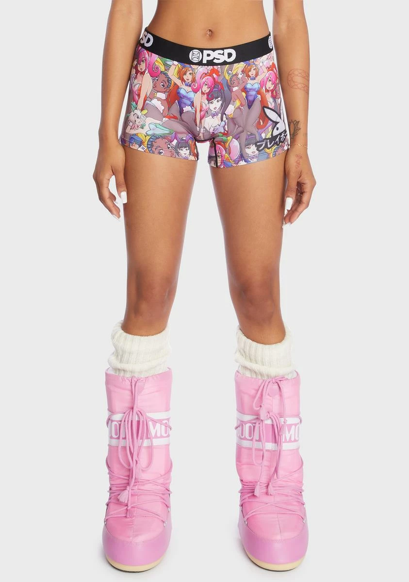 wanna play? These boy shorts have a Playboy bunny graphic at the side and back, anime character graphics all over, a stretchy and breathable construction, a stretchy waistband with moisture-wicking properties, flatlock seams, and a lined gusset.