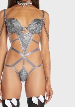 are you thinking of me? This two piece lingerie set includes a bra with underwire support, sheer striped elastic cups with cutouts, shimmery accents, adjustable straps, and a clasp closure, and matching thong panties with a high cut design.