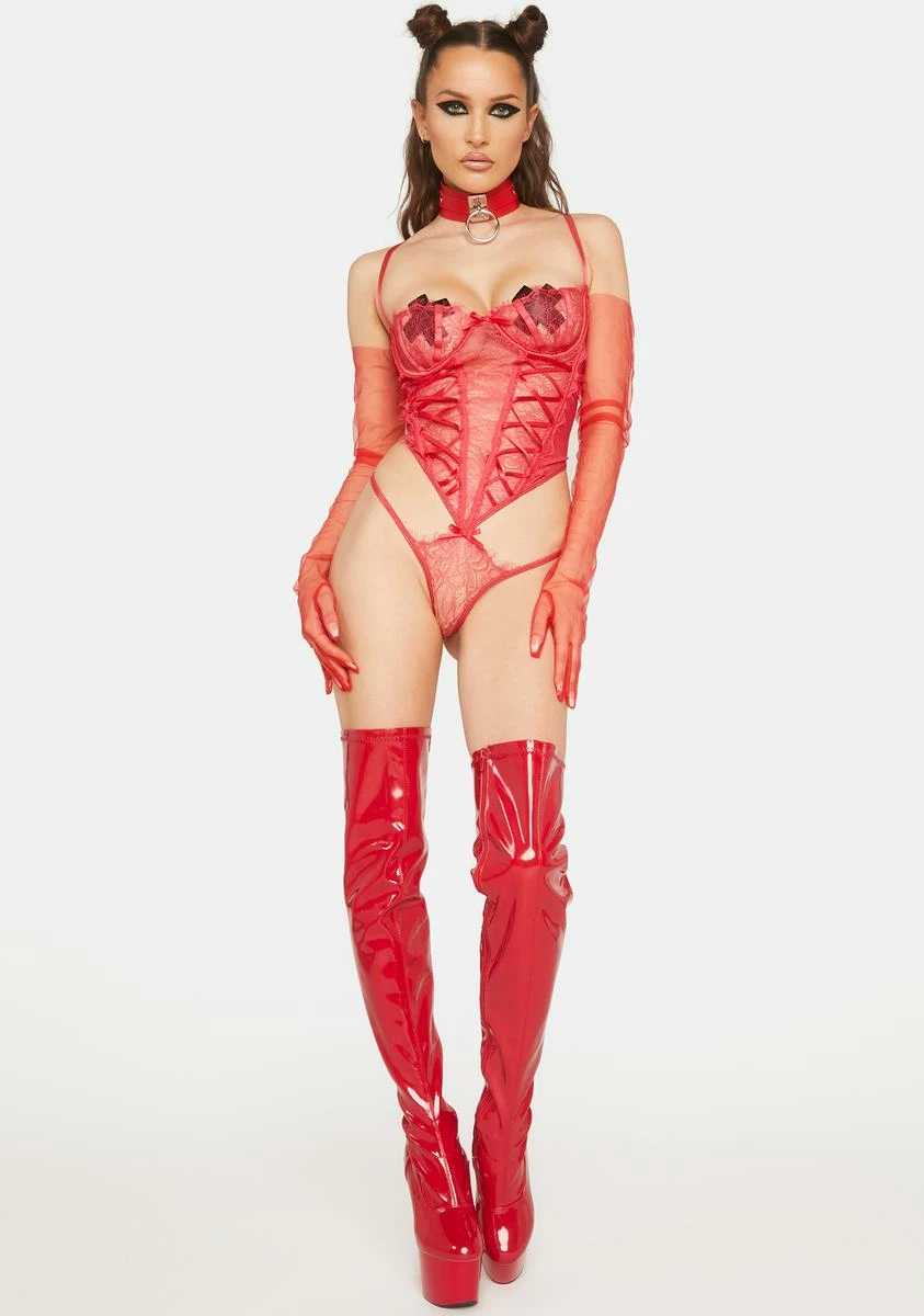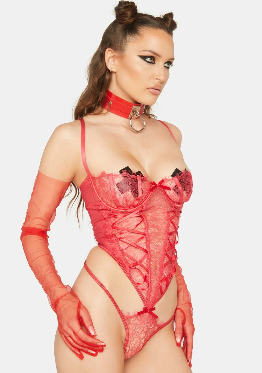 send my love. This teddy has a sheer lace construction, decorative lace up details down the front, demi bra cups with eyelash lace trim, cutouts across the hips, a thong bottom, and a clasp closure.