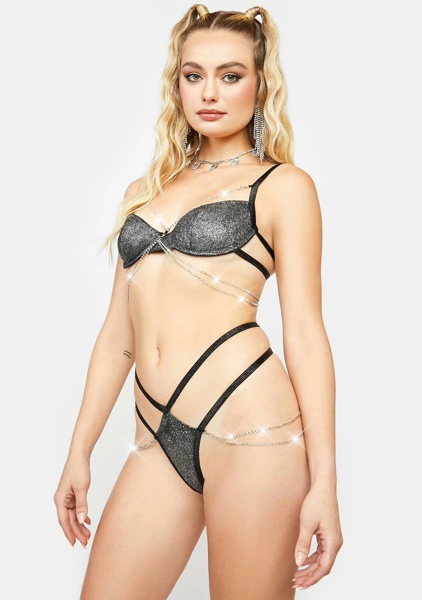 includes a sparkly bra top with underwire support with a matching strappy thong and rhinestone chain details.