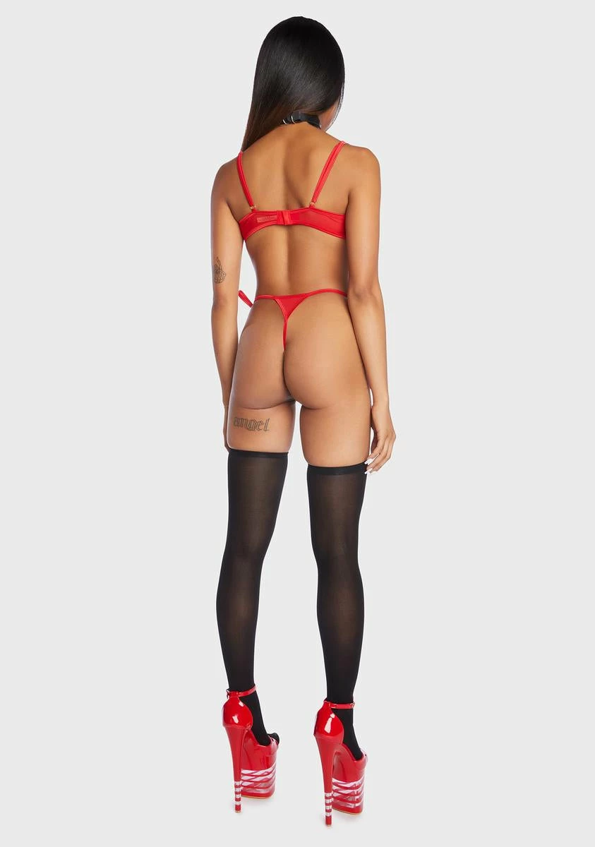 have you been good this year? This 2-piece lingerie set has a satin and sheer mesh construction, balconette underwire bust cups, adjustable shoulder straps, and back hook-and-eye closures. Includes a bra with a satin bow applique and an adjustable side tie thong with pom poms and embroidered details.