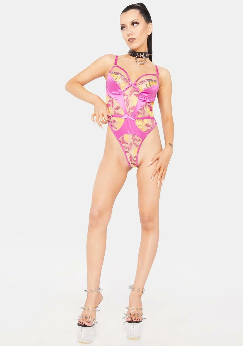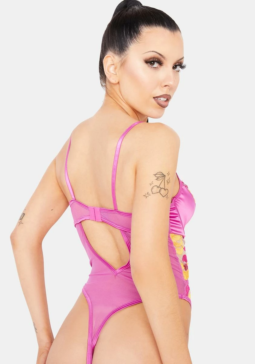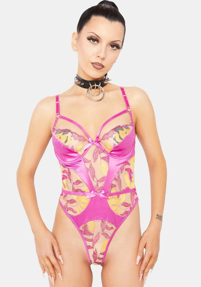 come unwrap me. This teddy has a two-tone floral print, demi bra cups with underwire support, mixed sheer mesh and satin paneling, a satin ribbon tie at the waist, and clasp closures at the back.