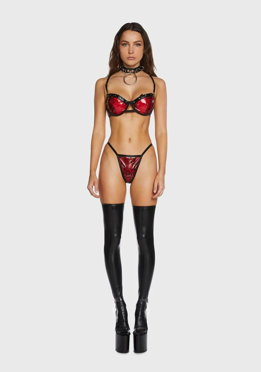 give ’em that come hither look! This 2-piece lingerie set has a stretchy vinyl and vegan leather construction, a snakeskin print all over, demi underwire bust cups, stud hardware, and back hook-and-eye closures. Includes a bra and a G-string thong.