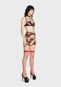 cuz you’ve been tempted. This teddy bodysuit has a satin and sheer floral lace construction, V-shaped underwire, adjustable shoulder straps, a strappy caged back with hook-and-eye closures, and thong rear coverage.