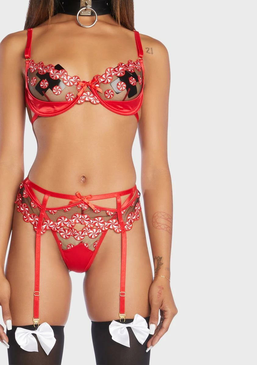 won’t you ride my sleigh tonight? This 3-piece lingerie set has sheer tulle panels with peppermint embroidery, adjustable shoulder straps, back hook-and-eye closures, satin bow appliques, and adjustable garter straps. Includes a demi cup bra, garter belt, and thong.