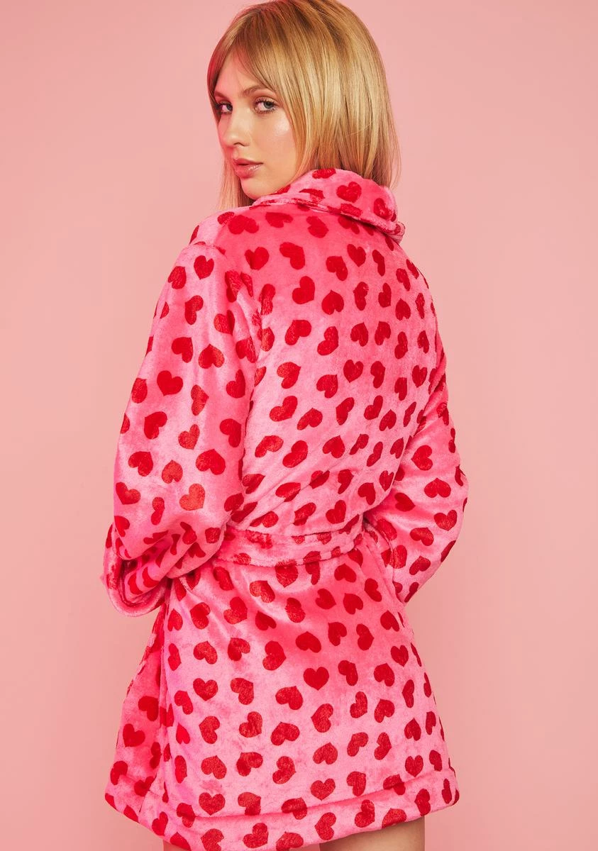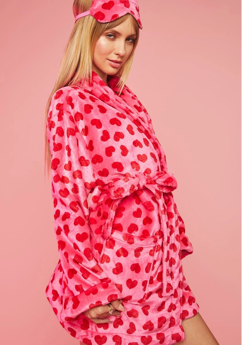 cuz they’re under your spell. This heart print velour robe has a waist tie closure, pockets on the front, and comes with a matching eye mask.