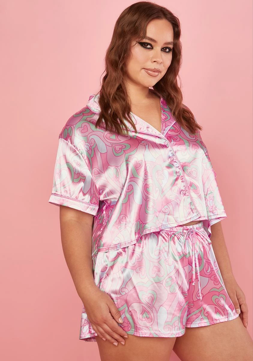 cuz groovy or not, here I come! Look happening in this pajama set that comes in a satin construction, with a button up short sleeve top, collared neckline, matching shorts, with an elastic waistband, tie waist closure, and a swirl heart print all over.