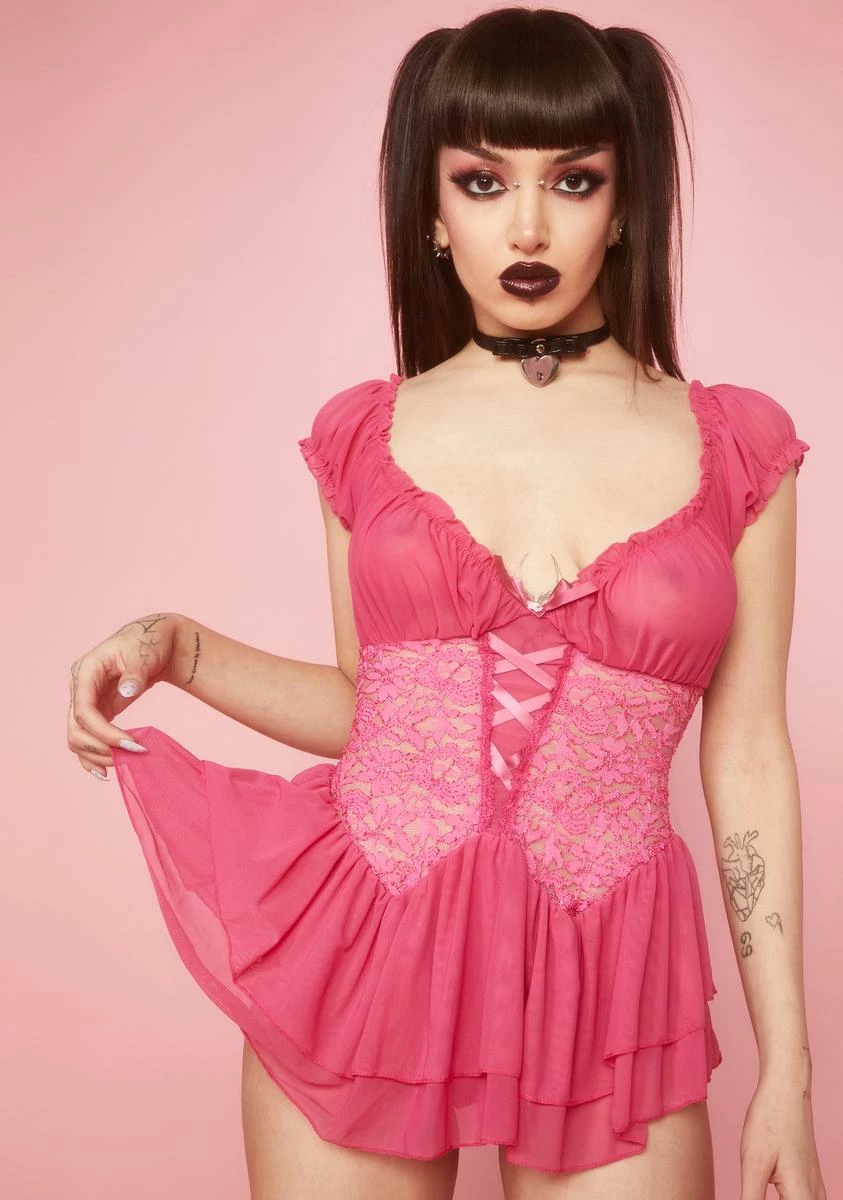 cuz it’s past midnight. Dance the night away in this mesh teddy with lace detailing, cap sleeves, a plunging neckline, and a tiered ruffle hem.