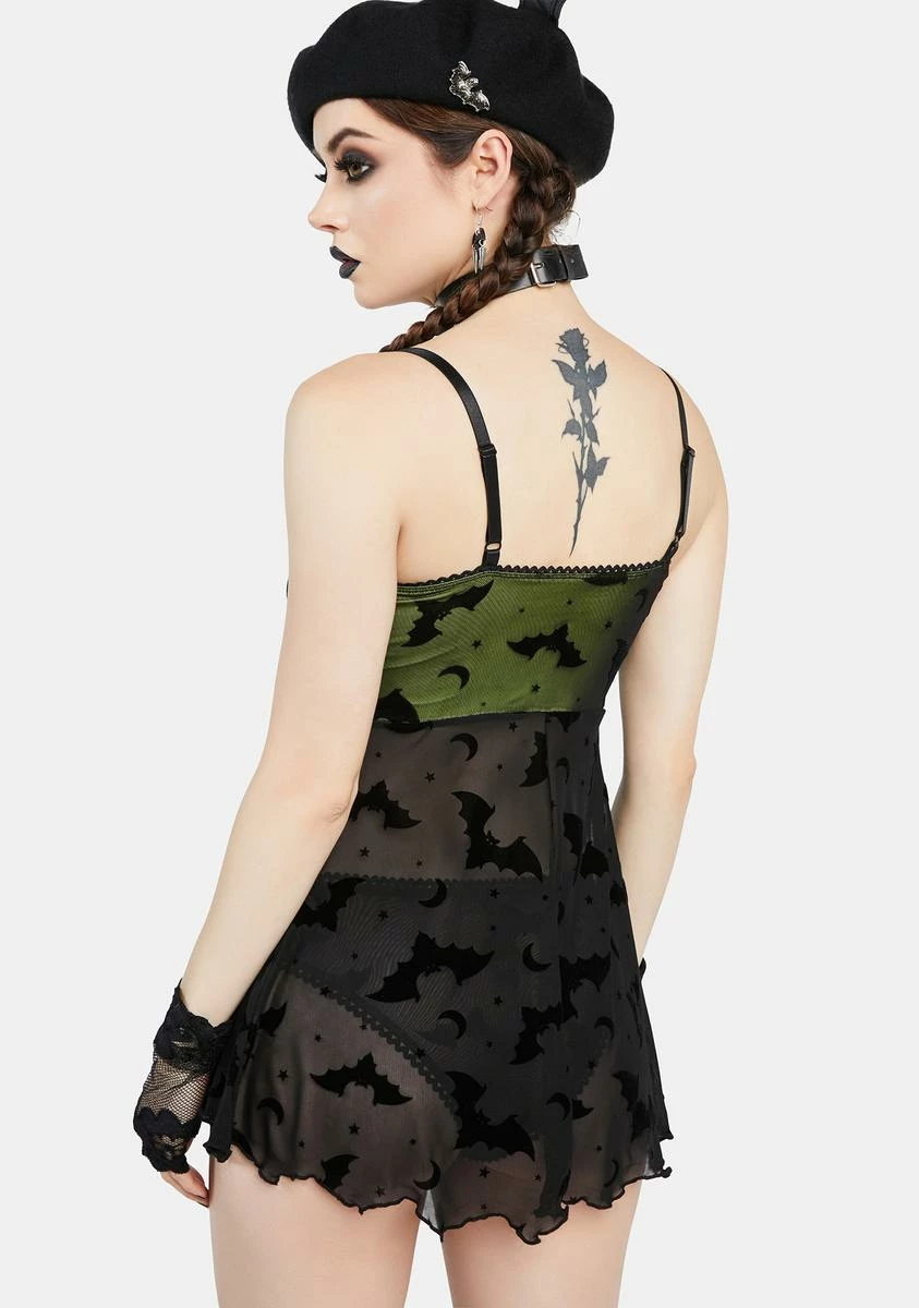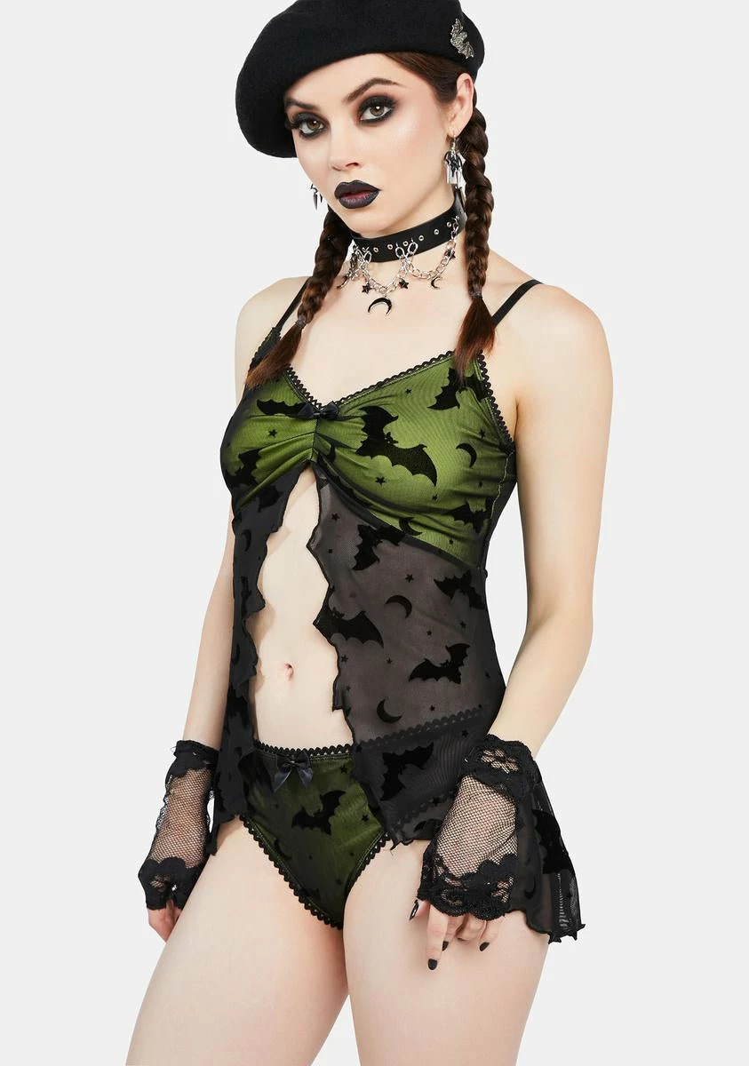 sink your fangs in this. This lingerie set comes in a mesh construction, with an open-front nightie, lettuce edge trim, adjustable straps, contrast lining, matching briefs, with velvet flocked details, and a bat print all over.