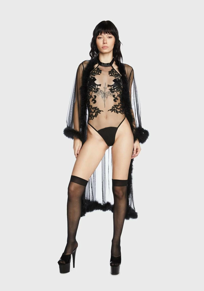 cuz do you drive them wild? This bodysuit has a sheer mesh construction, embroidered floral detailing, a satin high neckline with tie closures in the back, and an open back with a button closure.