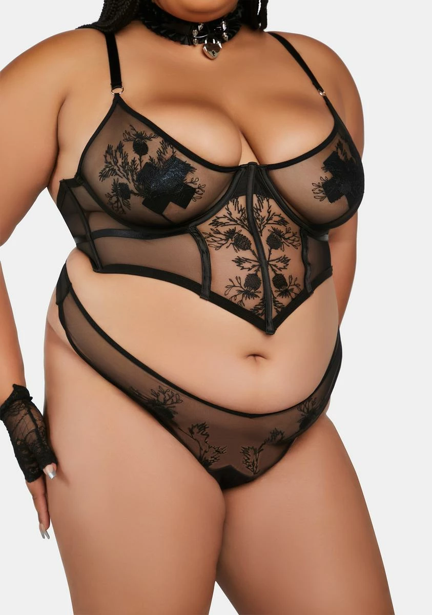 cuz you are deeply loved. This thong has a sheer mesh construction, floral embroidery at front, high-cut legs, and a V-waist detail.