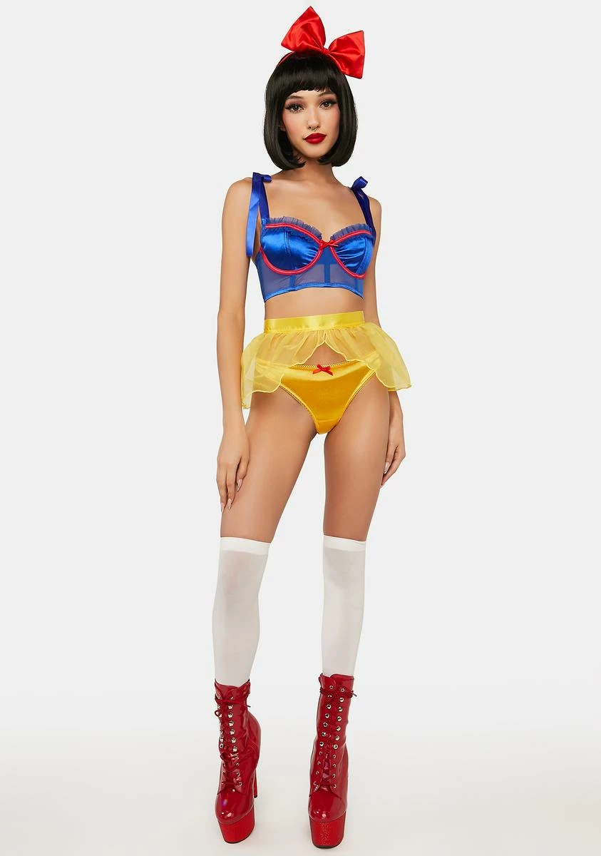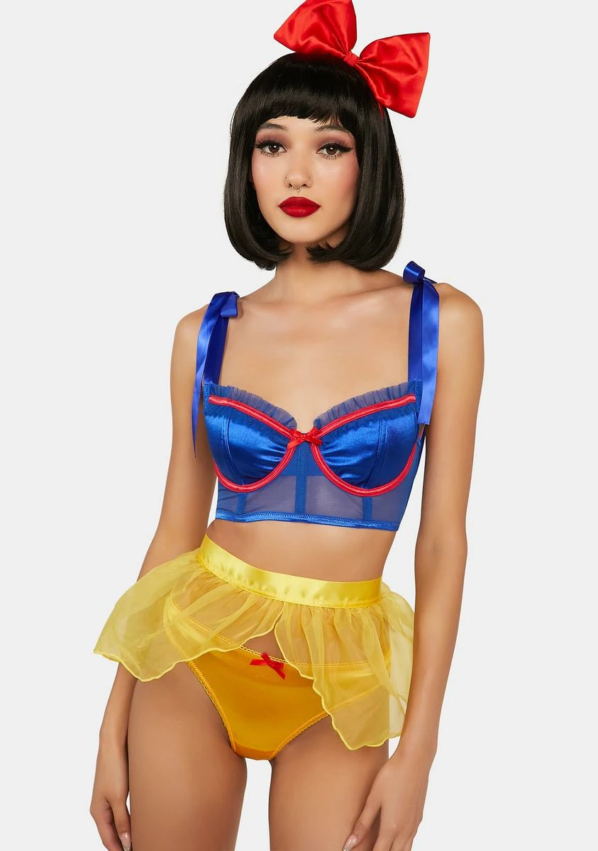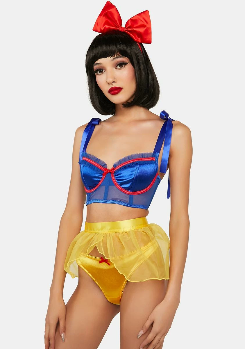 mirror, mirror, on the wall… This classic princess lingerie set has a satin bustier bra top, a low rise thong panty with a bow detail, a ruffle tulle belt with ribbon tie closures, and a statement red bow headband.