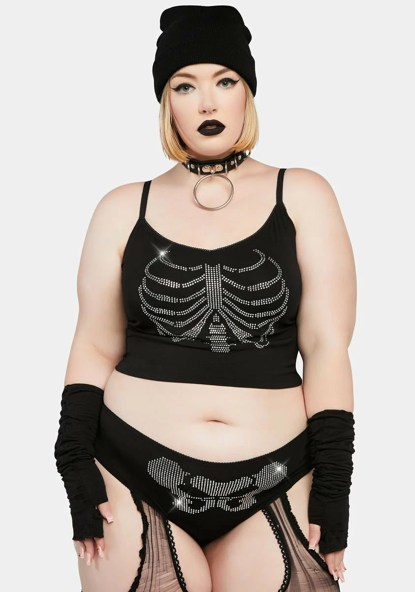 cuz you’ve got a bone to pick. This 2-piece crop top and undies set has skeleton bone-shaped rhinestones at the chest and rear, adjustable shoulder straps, and a soft and comfy construction.