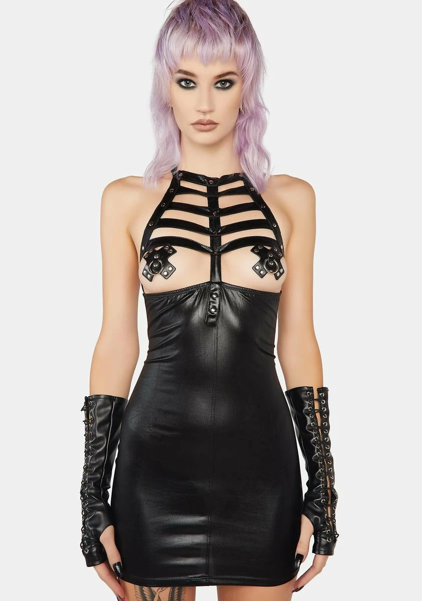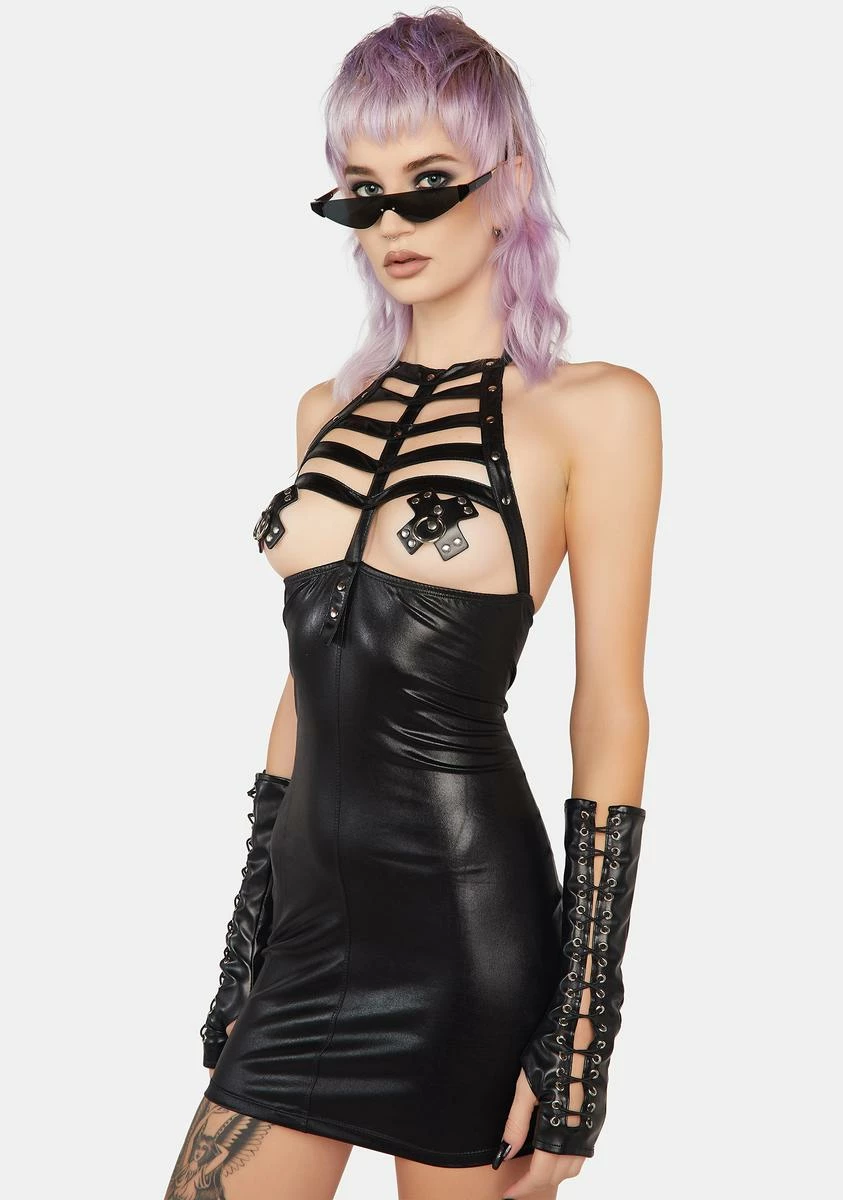 cuz they’d be lucky to have you. This mini dress comes in a vegan leather construction, with a bodycon fit, chest cut out, caged halter neckline, open back, and a back zip closure.