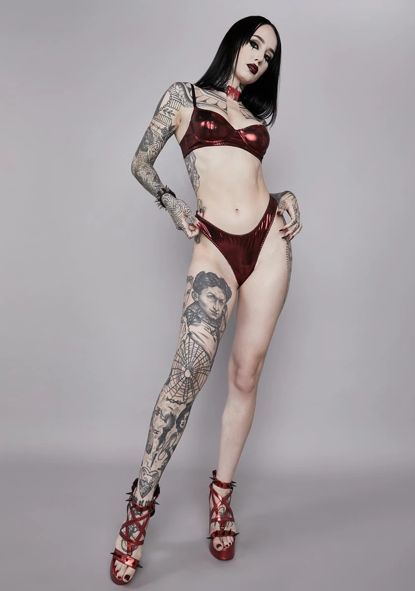 it’s a total eclipse of their souls. This lingerie set includes a bra top that has a metallic vegan leather construction, an underwire bust, contrast colored adjustable shoulder straps, and matching thong panty.