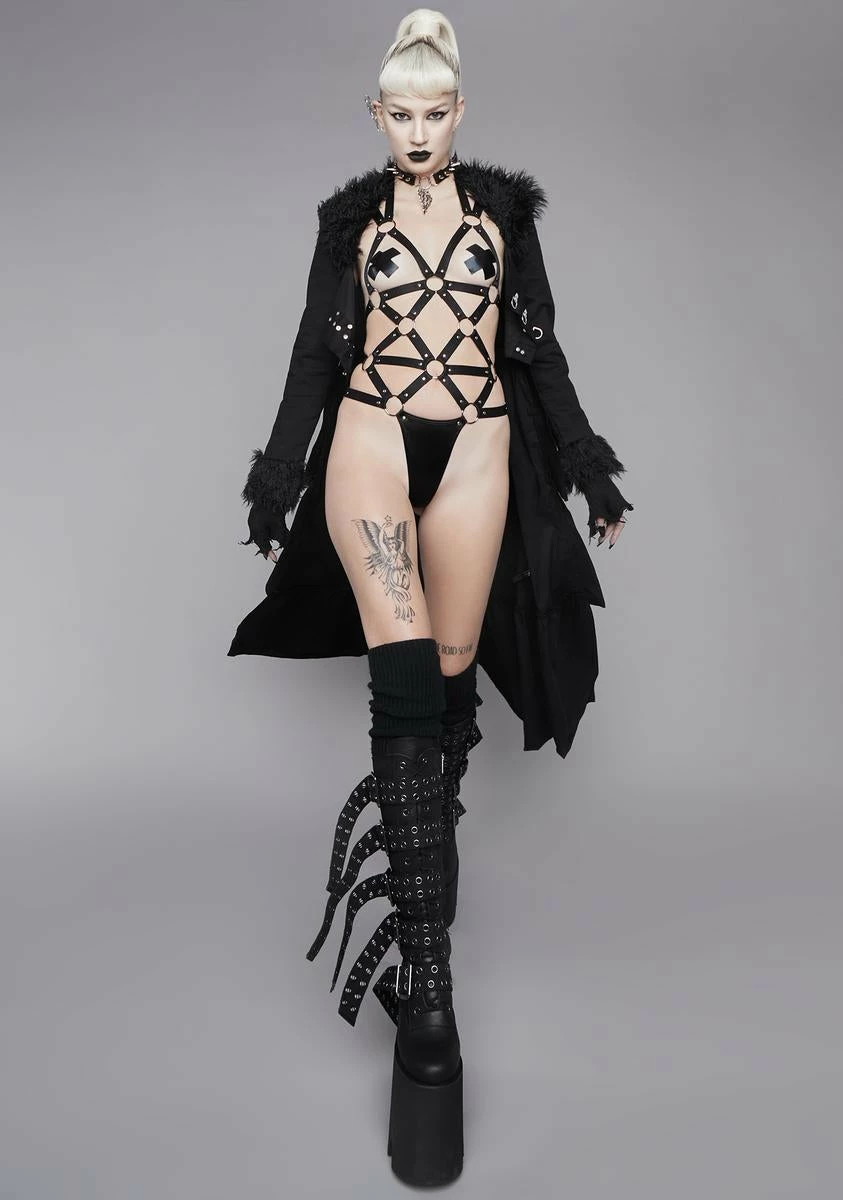 cuz you’re trouble. This harness comes in a elastic stretch construction, with o-ring and stud details, and adjustable shoulder straps.