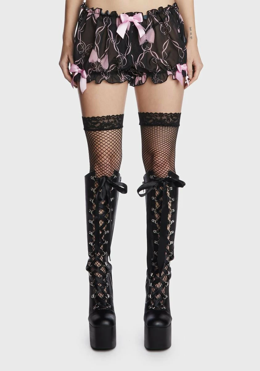 cuz you’re startin’ to unravel. These low-rise bloomer shorts have a non-stretch sheer chiffon construction, a bow print all over, bow appliques at front, and stretchy elastic trim.