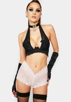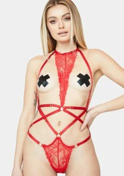 cuz you’re too good to be true! Less is more with this teddy that has a halter neckline, scalloped lace paneling down the chest, adjustable crisscross straps across the stomach and waist, an open back, and a thong bottom.
