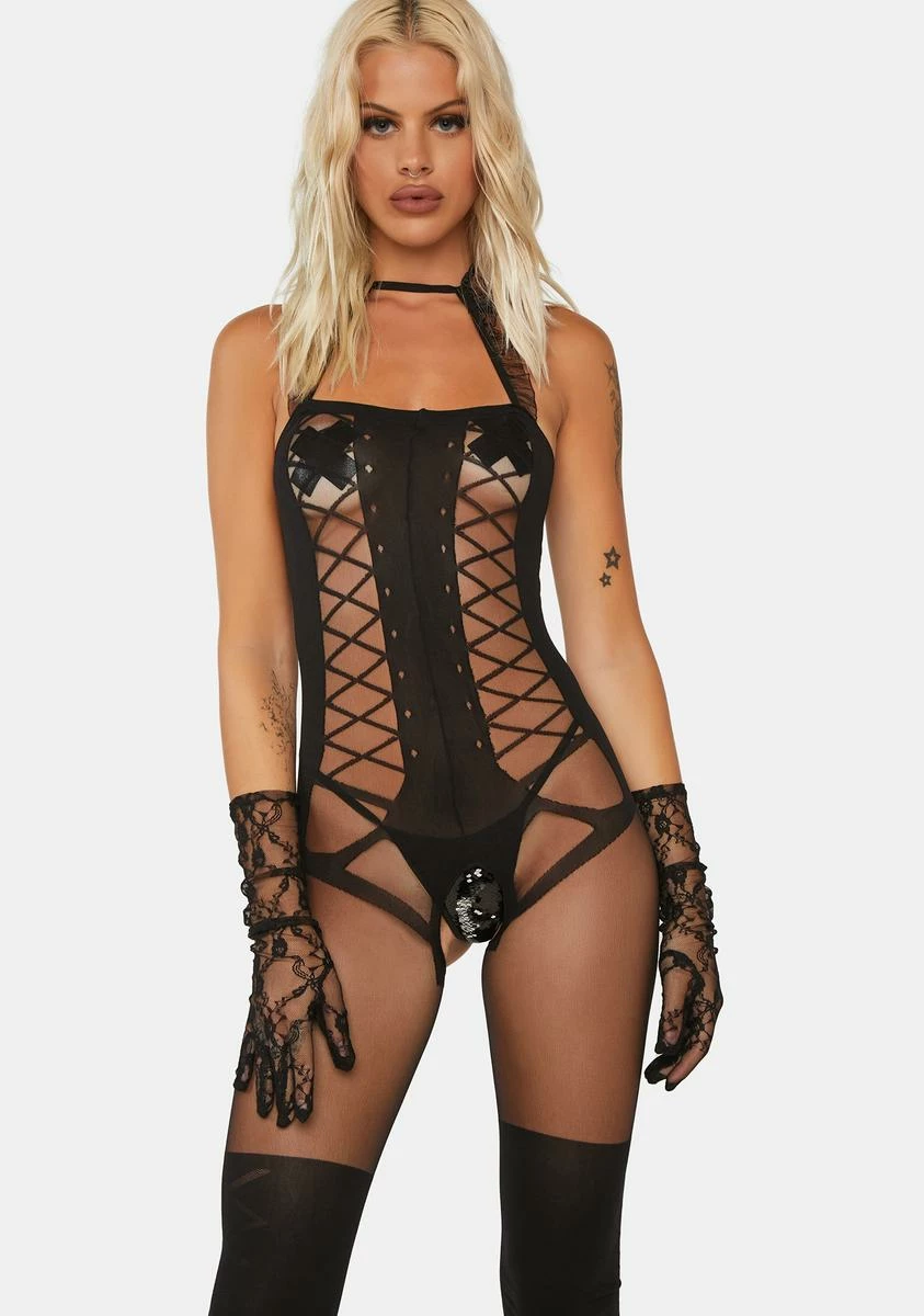 cuz it’s the only way you know. This bodystocking has a stretchy sheer mesh construction, a high halter neckline with adjustable ties, opaque mock lace-up straps and thigh-high socks, and a crotchless cutout.