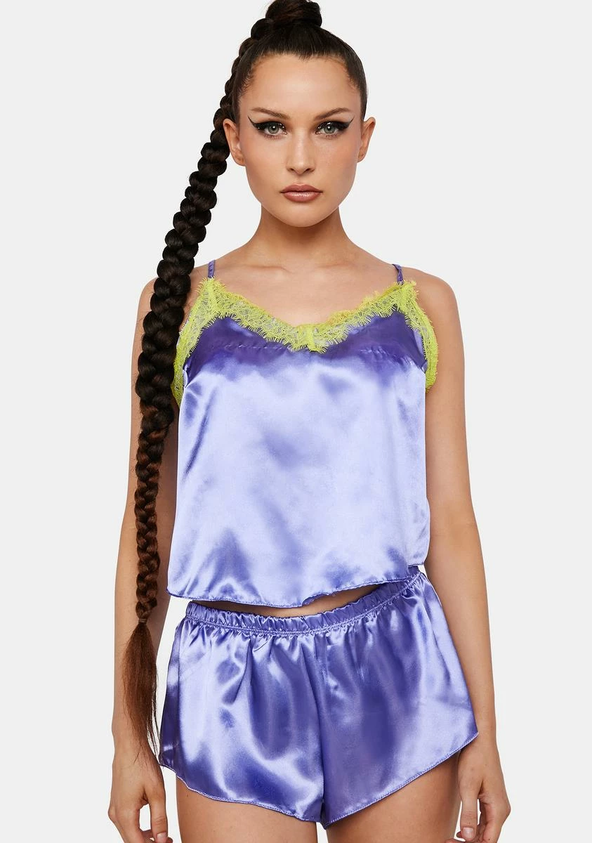 they’re always thinking about you, babe. This satin pajama set has a contrast lace trim cami tank, adjustable shoulder straps, and matching lounge shorts with an elastic waistband.