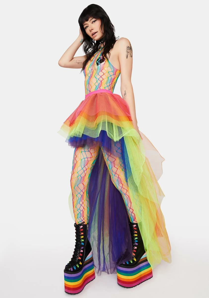 cuz you’re my main squeeze. Declare your love with this bodysuit that has a sheer fishnet construction, an all over rainbow pattern, a mock neckline, and a bodycon fit.