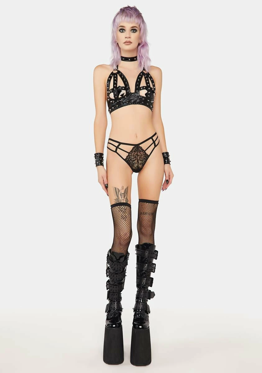 cuz you’re ready to ride. This panty has a stretchy sheer lace construction, side and back cutouts, and caged straps.