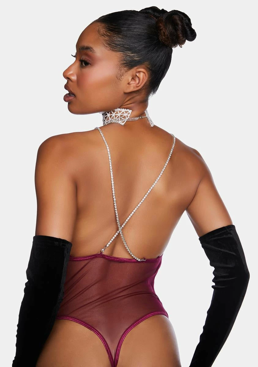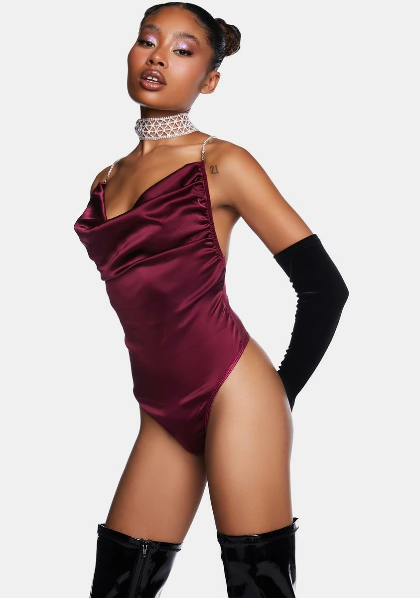 cuz you can’t hold back. This bodysuit comes in a satin construction, with a cowl neckline, rhinestone crossed straps, a sheer backside, and thong cut.
