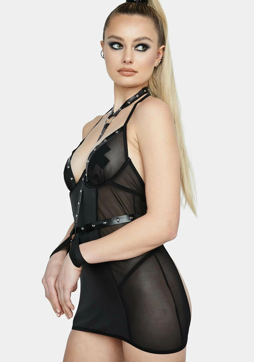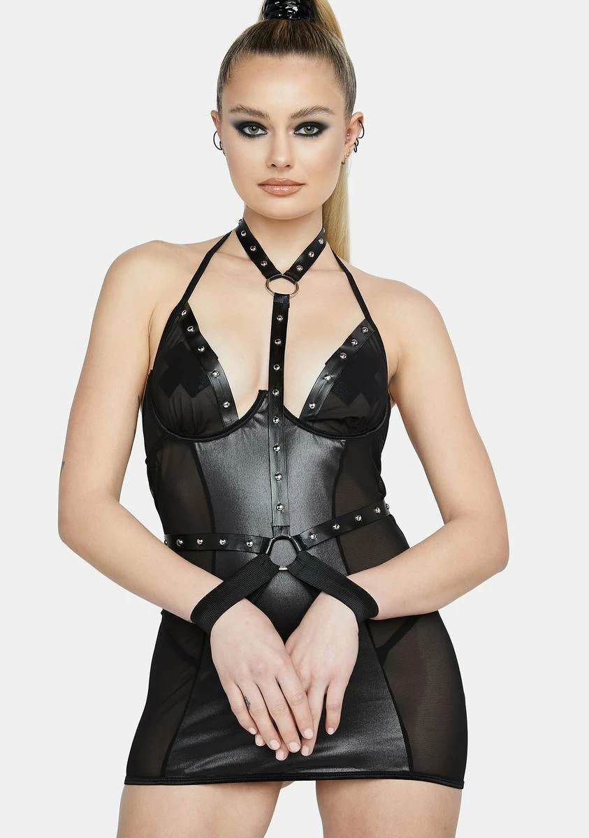 cuz you’re ready to dominate. This mesh and vegan leather chemise comes with a matching studded harness and attached wrist restraints.