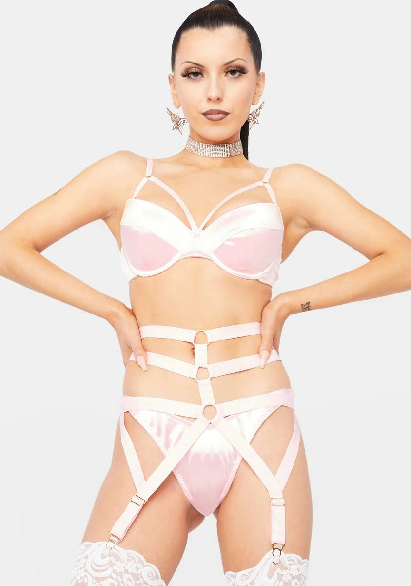 comes with a bra, in a satin construction, with adjustable straps, a back hook and eye closure, strap details, a matching thong, and a strappy garter belt with o-ring details.