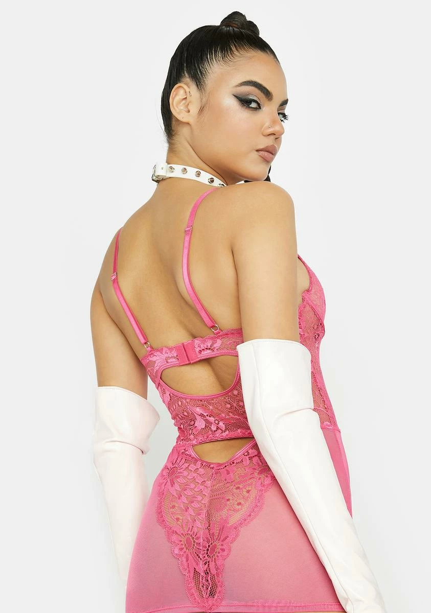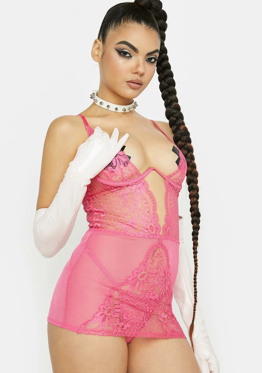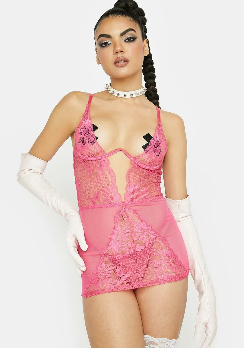 comes with a mesh floral lace babydoll, with a plunging v neckline, underwire, adjustable spaghetti straps, back cut outs, hook and eye closure, and a matching thong.