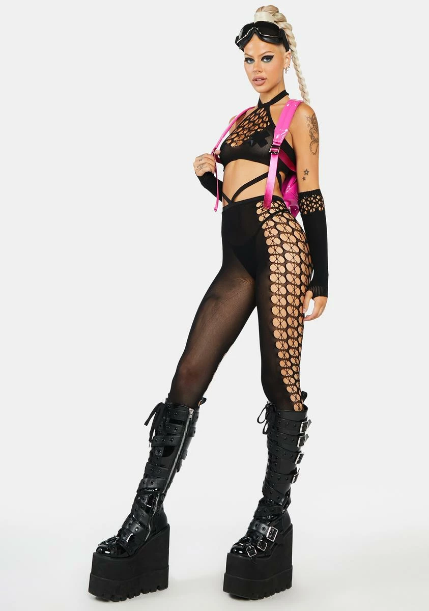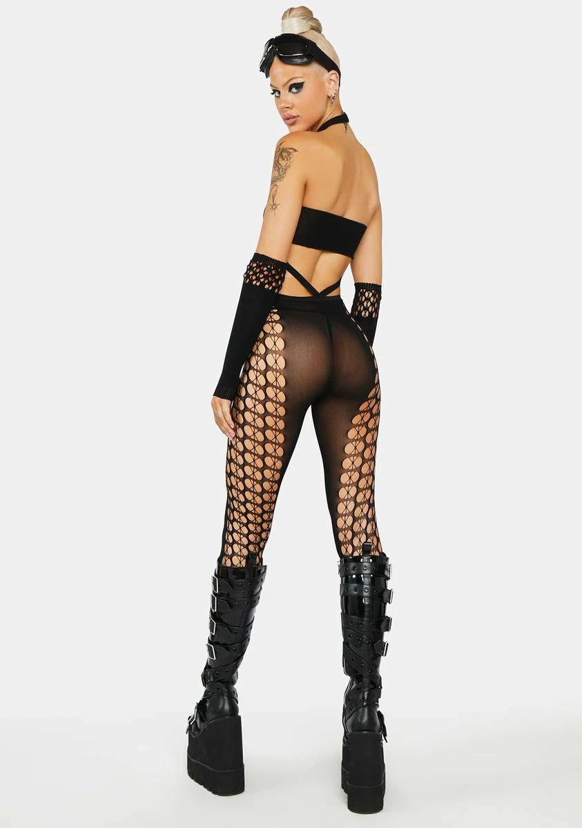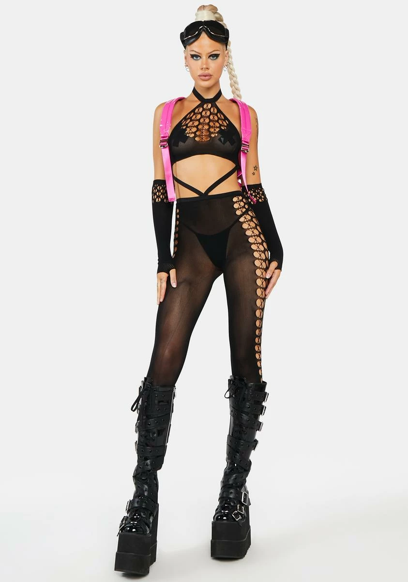 cuz you’re mine. This body stocking has a sheer mesh construction, a halter neckline, a cut out hole design on the front and on the sides, detachable sleeves, strappy detailing, and a bodycon fit.