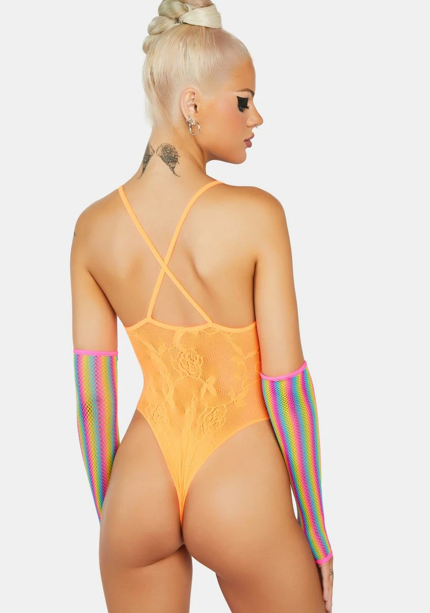 who wants strings attached? This sleeveless bodysuit has a stretchy sheer lace construction, high-cut legs, crisscross shoulder straps, and thong rear coverage.